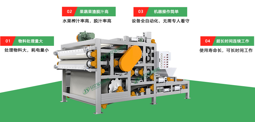 果蔬果渣经过输送机,输送到高压对辊压榨脱水机的布料器中,通过螺旋布料器均匀平铺在网带上,同时控制好平铺在网带上厚度,网带随着设备的运行,然后上下两条完全涨紧的环状网带夹住果蔬果渣物料,在驱动辊带动下,分别通过预压脱水区和三组对辊高压区进行对辊连续多次机械物理挤压,将大量的汁液压出。根据物料的特性调节挤压力度,满足客户对物料水分要求。